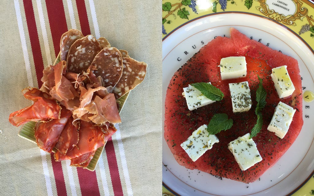 We retreated from the fierce lens of sun to the canopy of an enormous linden tree. “Lunch is very easy. It’s all cold,” Youmna said—and all made fresh at home. There was charcuterie, a fish spread daubed onto savory pancakes, a salad of watermelon with feta and mint, cold roast beef with mustard, cold ocean trout with lemon hollandaise, and, for dessert, homemade strawberry ice cream with pêche au vin.