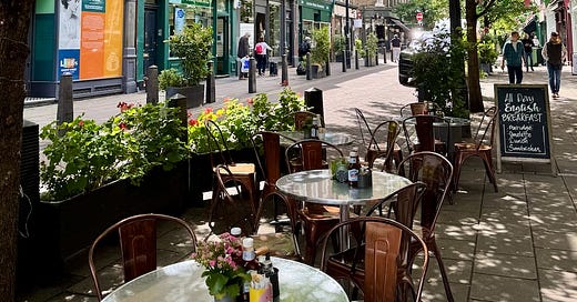 I’m seated at a small black table on a slatted wooden chair. No padded chairs available, all taken, the café version of haves and have-nots. Some people are working, some tending smiling children. There are a few attractive young professionals, urbane and relaxed even on Monday morning. I slept perhaps one hour on the plane, so would not call myself relaxed. I’ve never been urbane.