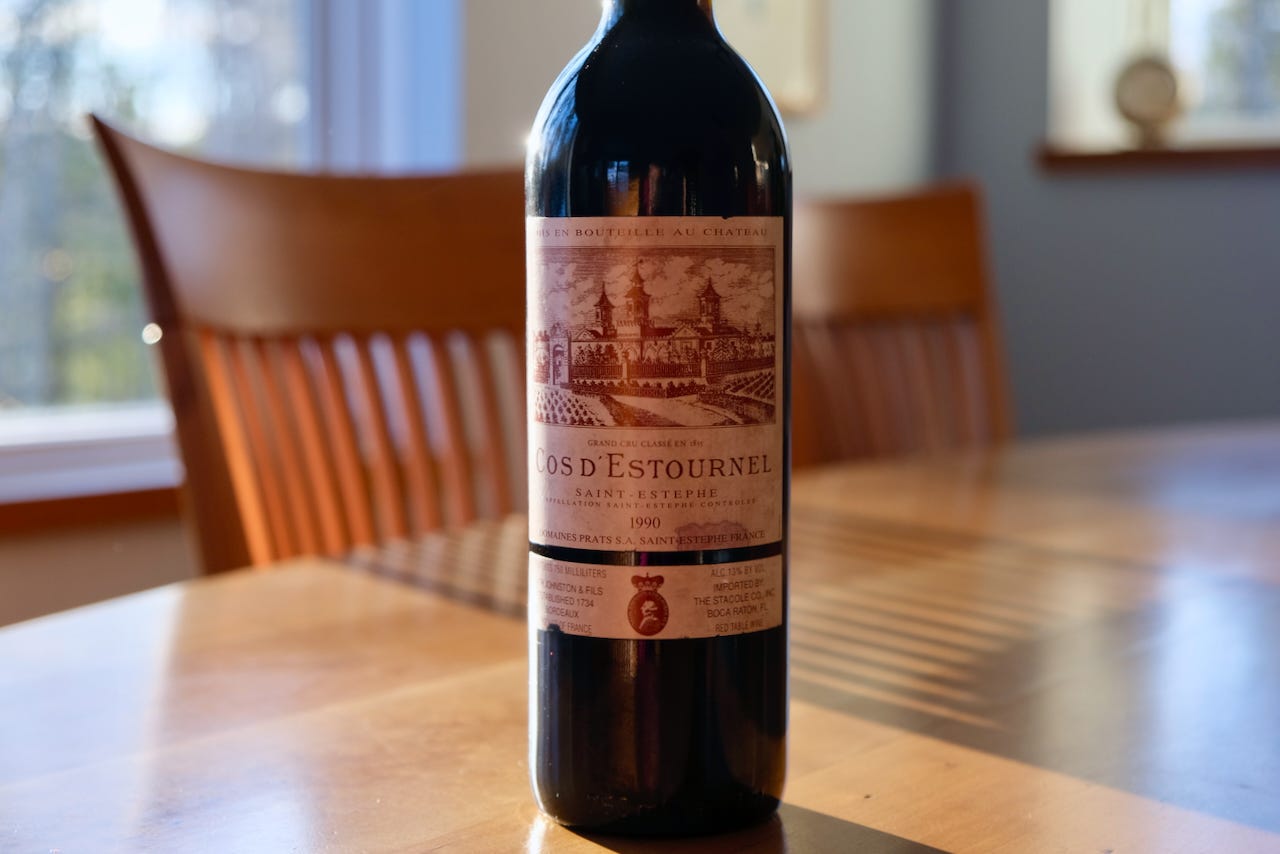 A friend with a deep cellar read my recent posts about tasting the 2015 Cos d’Estournel and the 2018 Pagodes de Cos, the producer’s second label, and offered a taste of his 1990. He’d purchased it off the shelf in 1992 or 1993 at a private shop in Washington, D.C., and stored it in his cold Vermont basement.