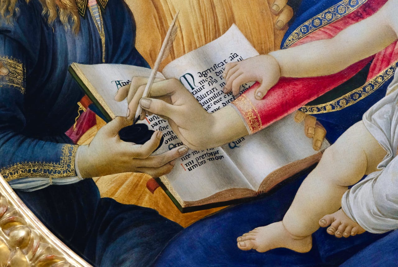 Alessandro di Mariano di Vanni Filipepi, detto Botticelli, “Madonna of the Magnificat” (detail), c. 1483. Photographed 6 June 2023 at the Uffizi Gallery, Florence, Italy; ©Meg Maker. A version of this essay also appeared in The Circular.