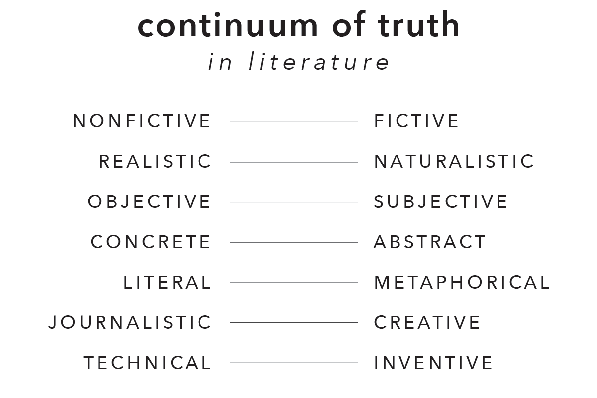 In fact, every genre of literary production, fictive and nonfictive, has elements of fact and elements of invention. A writer’s work slides back and forth along a continuum of truth. That makes many facets of the writing hard to pin down: A dialogue from an early childhood memory: Is it true? The color of the sky on the day she left: Is it true? What he was feeling as the song ended: Is it true? The gesture of the ghost who walked the ramparts: Is it true?