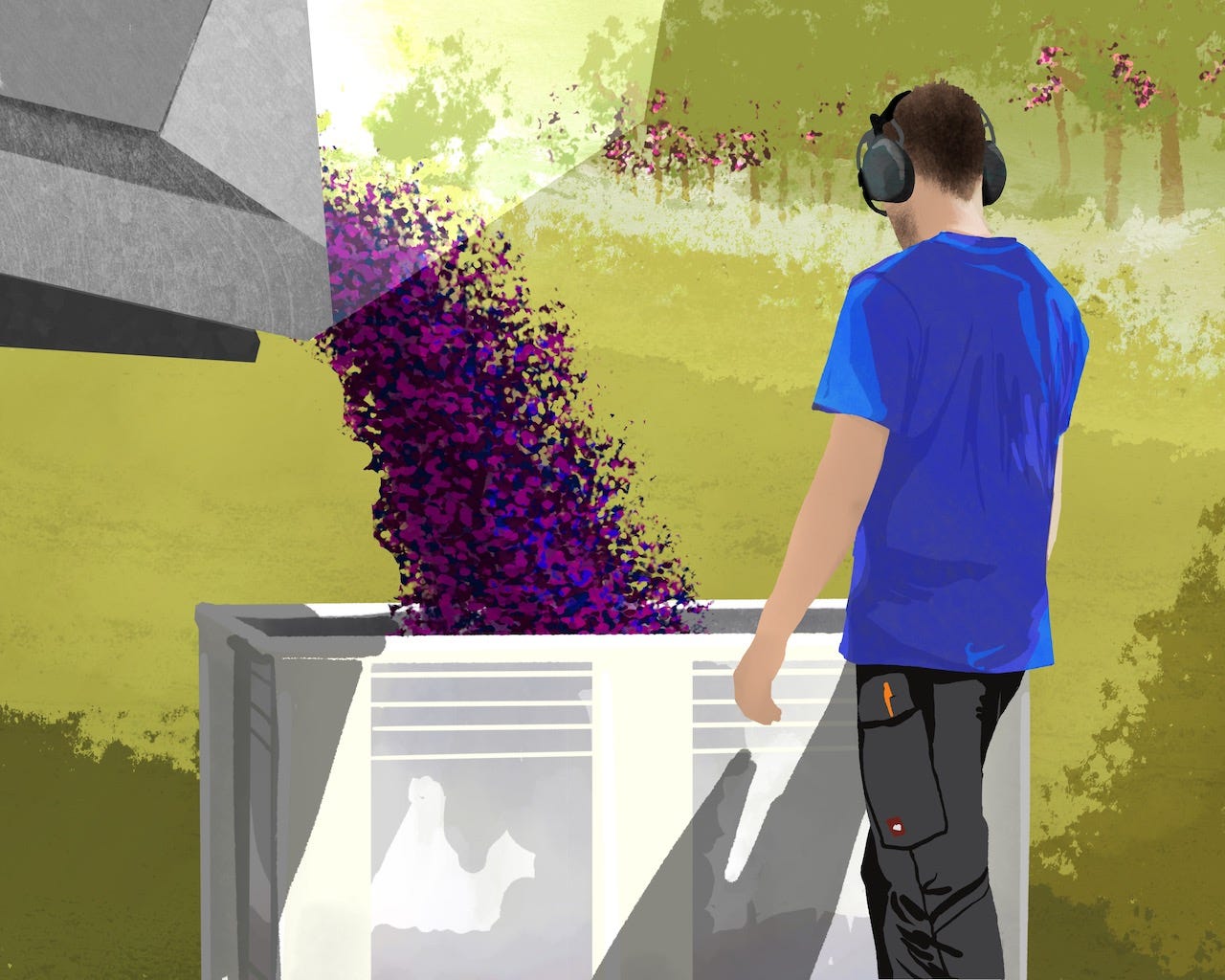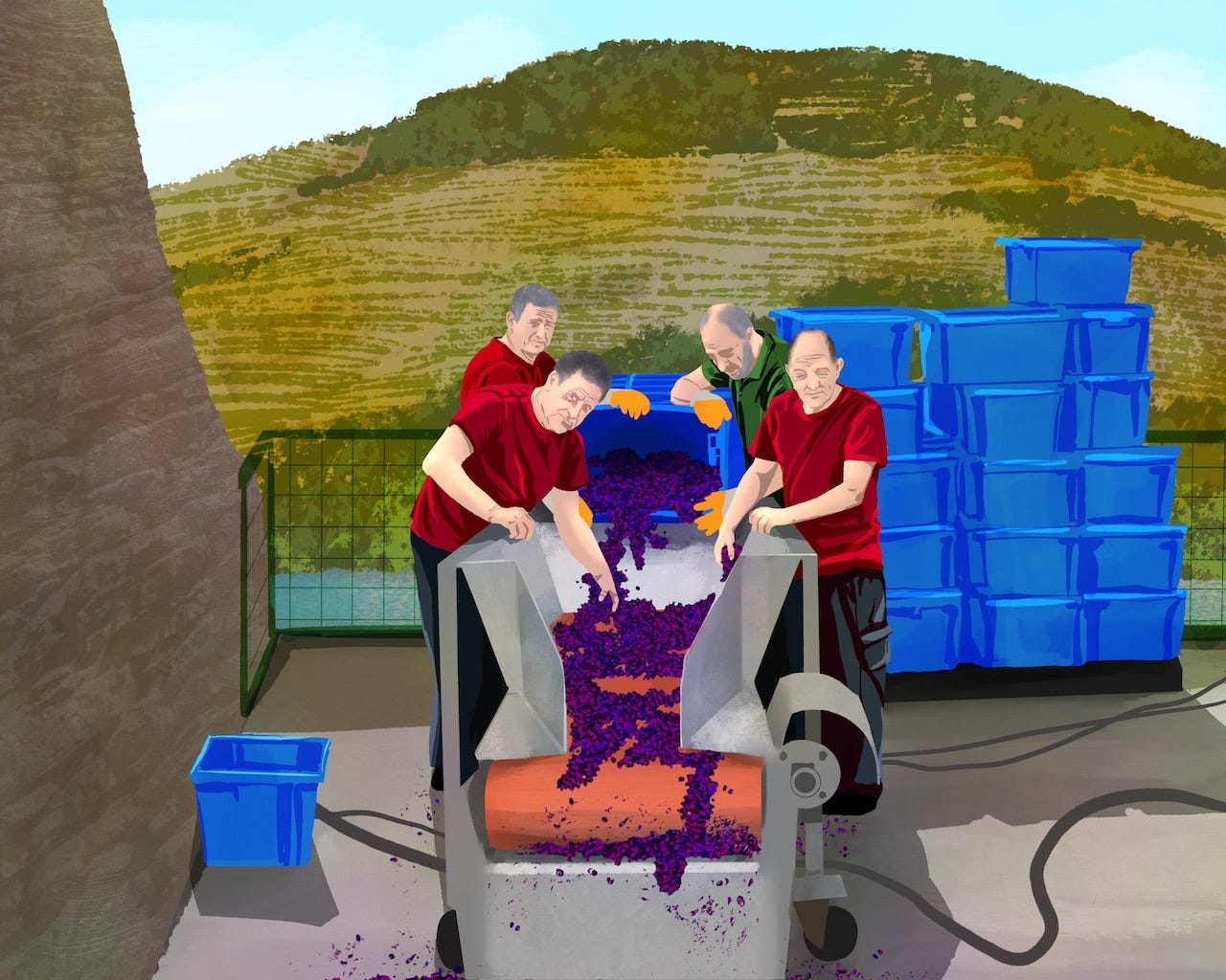 Grapes are handled multiple times prior to fermentation. Pickers often make multiple passes in a vineyard, selecting that day’s ripe clusters and leaving others for a second or third round. At the grape reception area, workers review each bin, winnowing out matter other than grapes (MOG) and any clusters with mold or damage before sending them on for vinification.