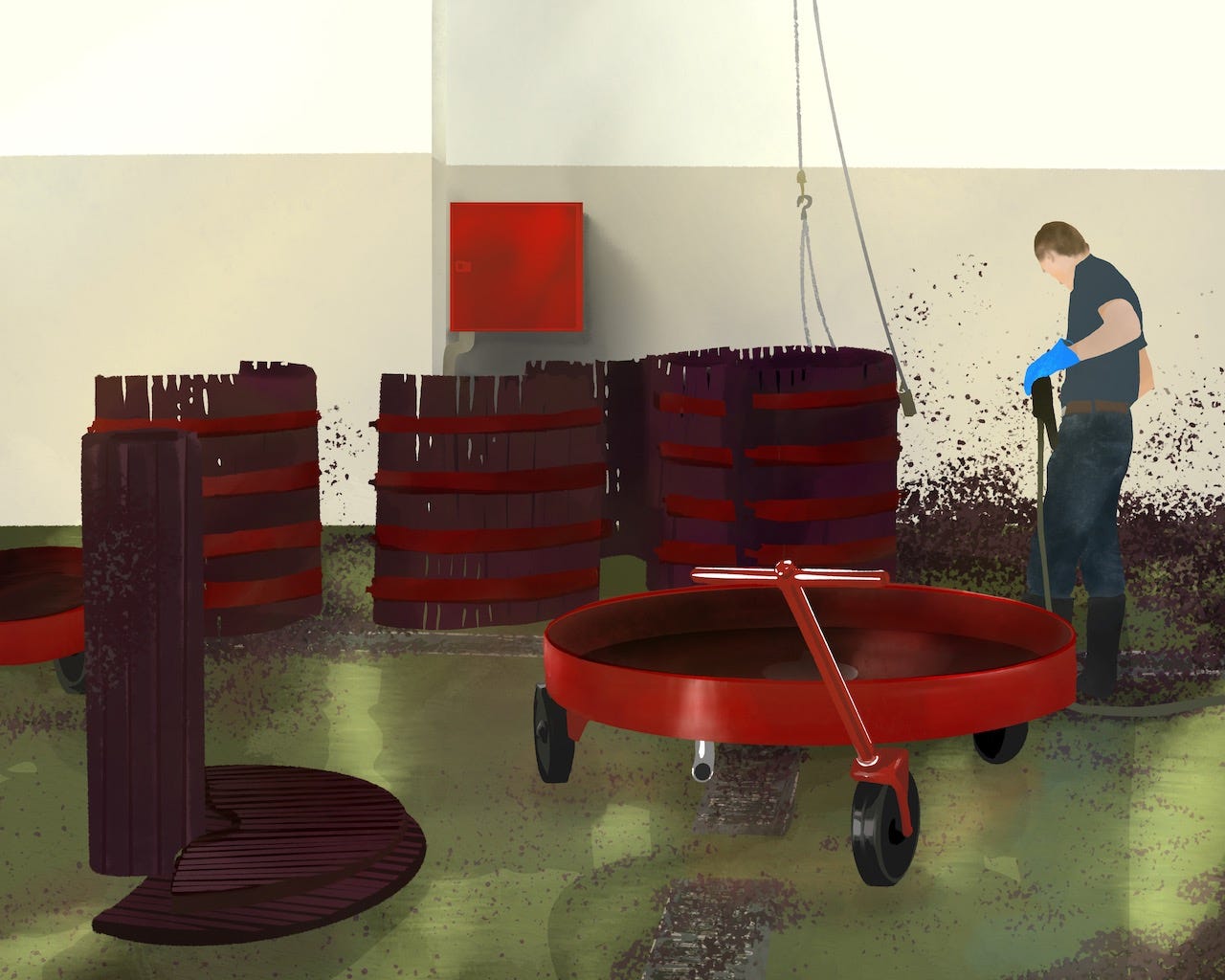 After vinification, the red must is pressed to extract maximum flavor, color, and tannin. Some quintas still use large basket presses like these, which, according to David Guimaraens, do the job without what he calls “over tumbling.”
